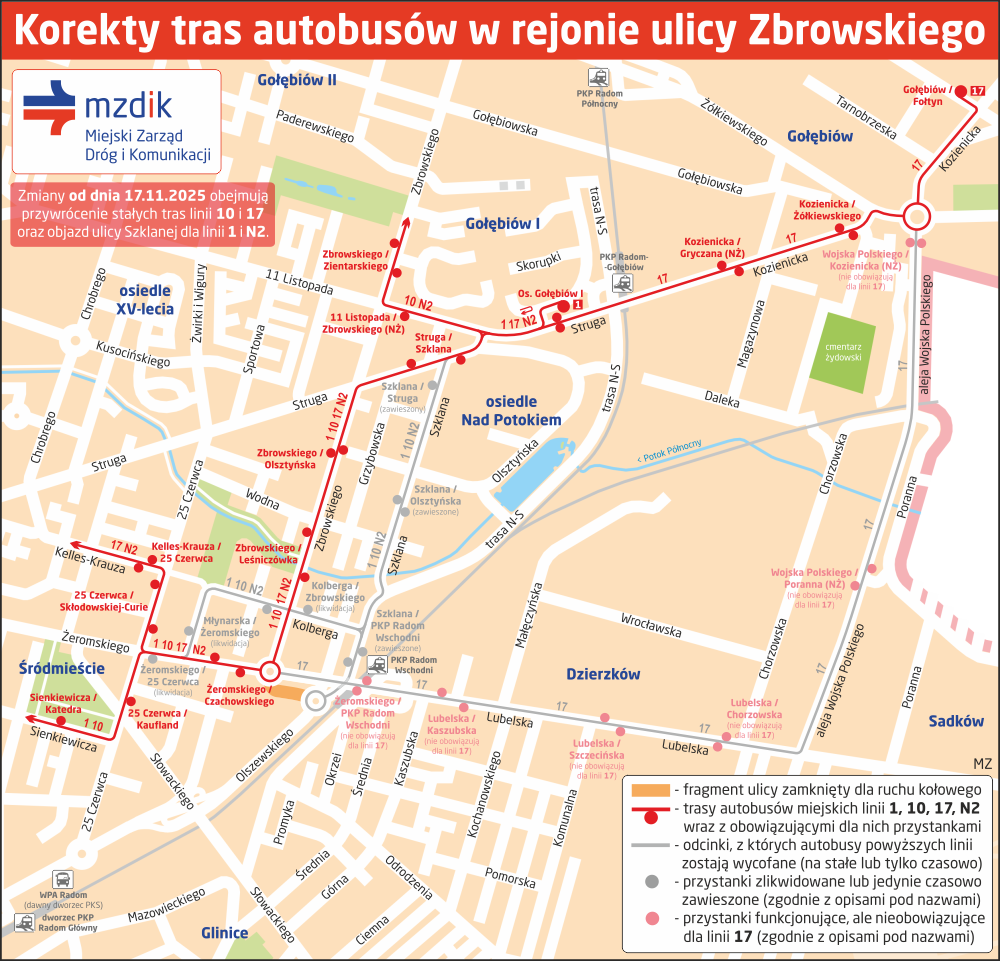 W związku z otwarciem dla ruchu (jedynie dla komunikacji miejskiej!) odcinka ulicy Zbrowskiego w rejonie budowanego ronda turbinowego na skrzyżowaniu z ulicą Żeromskiego, od dnia 17 listopada 2025 roku (poniedziałek) od około godziny 4:30 ulegną korektom trasy autobusów linii 1, 10, 17 i N2 w tym rejonie.