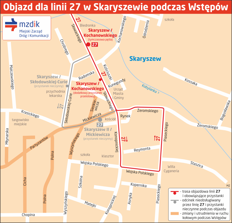 Podczas jarmarku Wstępy autobusy linii 27 zostaną wycofane z ulic Skłodowskiej-Curie i Mickiewicza. Będą kursowały objazdem ulicami Słowackiego, Konopnickiej, Wojska Polskiego, Piaseckiego, Żeromskiego i Słowackiego - do przystanku Skaryszew / Kochanowskiego 02 (w stronę Radomia, przed sklepem Biedronka), który w tym czasie będzie dla nich przystankiem końcowym.