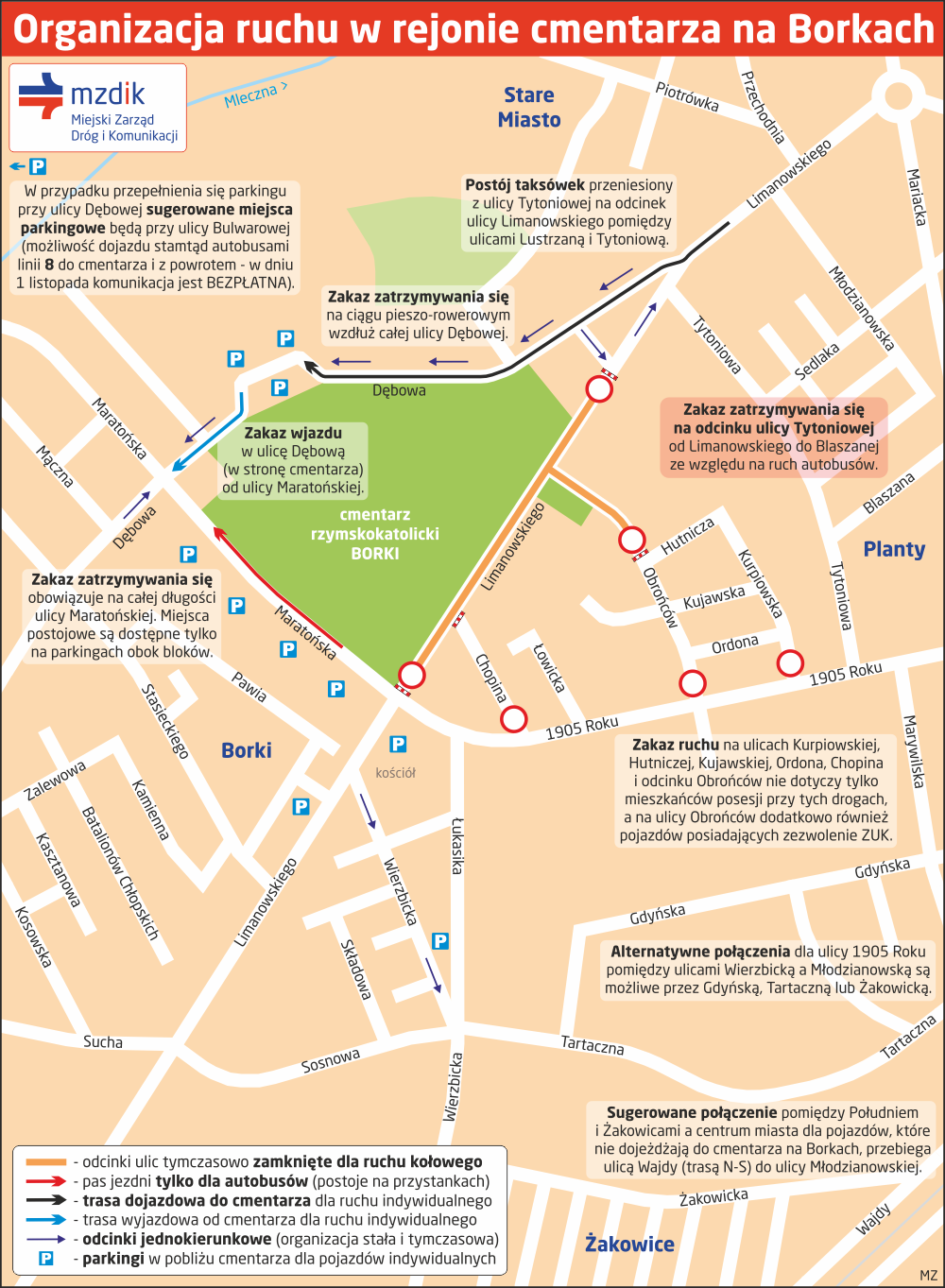 Zamknięcie dla ruchu kołowego odcinka jezdni między ulicami Maratońską a Tytoniową (z wyjątkiem warunkowego dojazdu do posesji oraz innych upoważnionych pojazdów - weryfikację uprawnień do wjazdu będą prowadzili policjanci i strażnicy miejscy). Wspomniany fragment jezdni będzie w tym okresie udostępniony przede wszystkim dla pieszych idących do oraz z cmentarza.