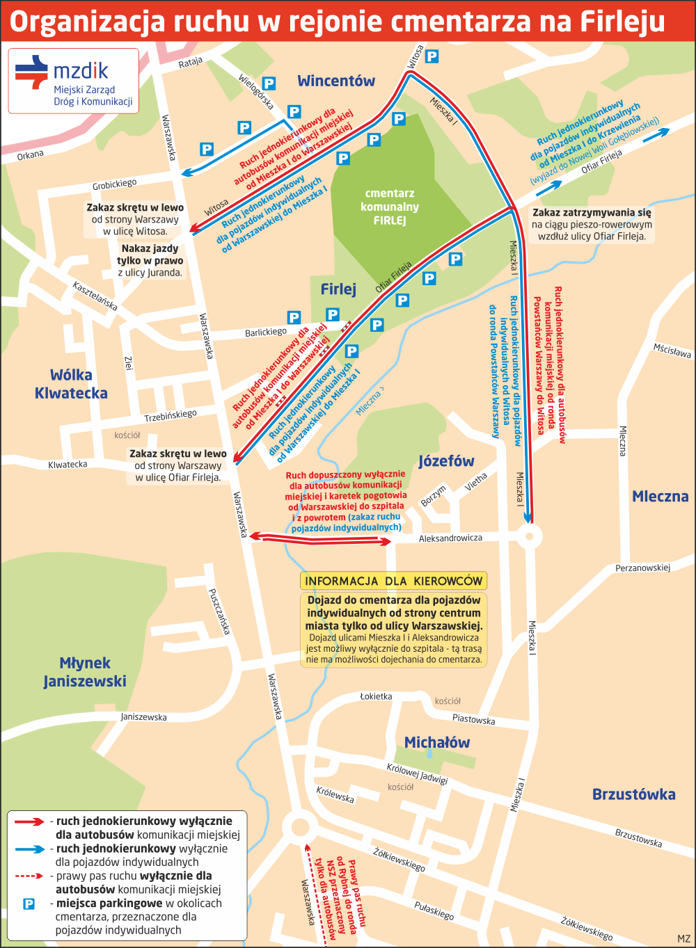 UWAGA! Dojazd do parkingów w rejonie cmentarza będzie możliwy jedynie od ulicy Warszawskiej. Pas jezdni na odcinku od ulicy Warszawskiej do Mieszka I zostanie przeznaczony wyłącznie dla ruchu pojazdów indywidualnych. Pas w przeciwnym kierunku, to znaczy od ulicy Mieszka I do Warszawskiej, będzie natomiast przeznaczony wyłącznie dla ruchu autobusów komunikacji miejskiej.