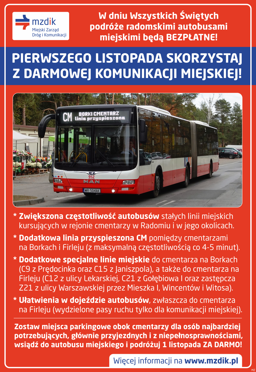 UWAGA! Informujemy, że 1 listopada 2025 roku komunikacja miejska w Radomiu będzie BEZPŁATNA dla wszystkich pasażerów.