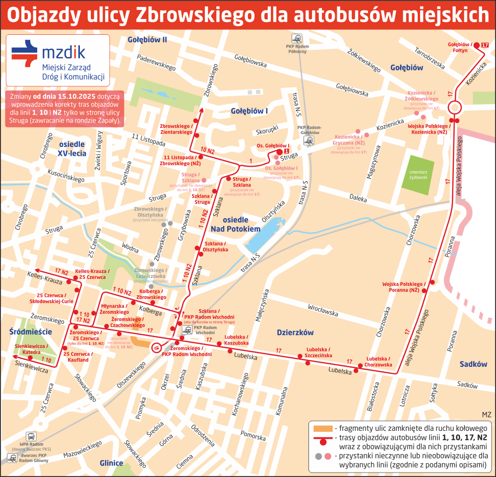 Objazd dla linii 17 nie zmieni się - w obu kierunkach: 25 Czerwca, Żeromskiego, Lubelska, aleja Wojska Polskiego, Kozienicka.