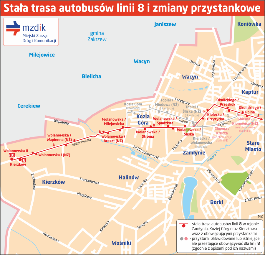 Autobusy linii 8 będą znów jeździć stałą trasą - w obu kierunkach ulicami Okulickiego, Kielecką i Wolanowską do pętli Kierzków (zaś wybranymi kursami, po których następuje zjazd do zajezdni Ślepowron - prosto Wolanowską do przystanku Wolanowska II). Zostaną one wycofane z ulic Topiel, Przysuskiej i Milejowickiej (w obu kierunkach) oraz z Głównej (w kierunku pętli Os. Wośniki).