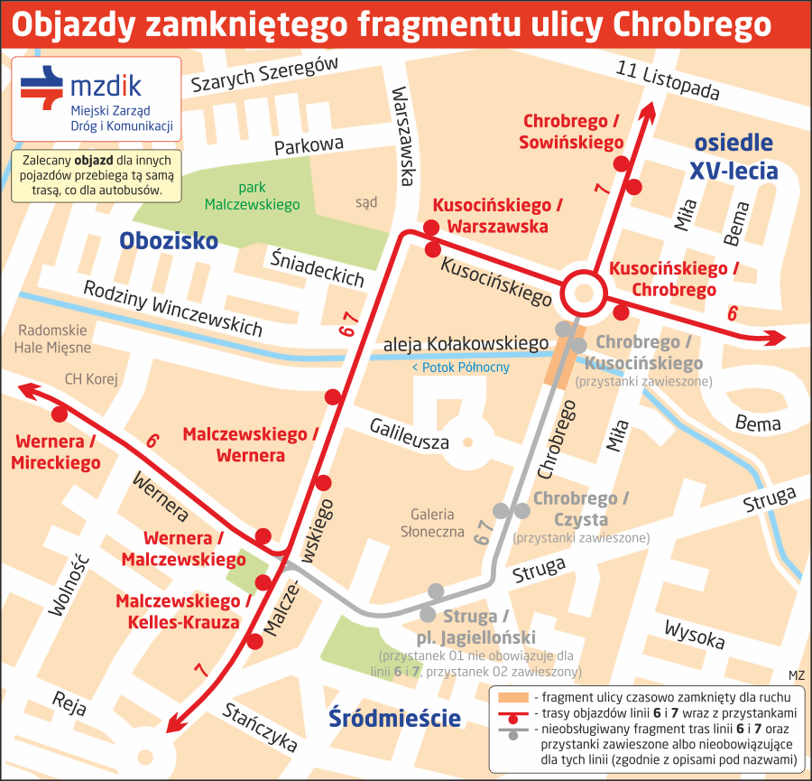 Zamknięcie jezdni dla ruchu kołowego będzie dotyczyć odcinka ulicy Chrobrego od salonu samochodowego przed mostem nad Potokiem Północnym do ronda Sybiraków. Zalecany objazd w obu kierunkach będzie przebiegał ulicami Struga, Kelles-Krauza, Malczewskiego i Kusocińskiego (ewentualnie także ulicami Struga, Żwirki i Wigury oraz Kusocińskiego lub pobliskimi drogami).