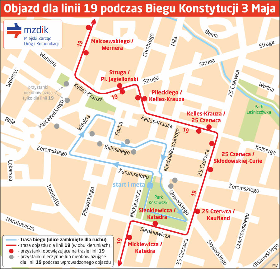 W związku z organizacją Biegu Konstytucji 3 Maja, w dniu 3 maja 2026 roku (niedziela) w godzinach około 8:00-10:30 zostaną wprowadzone czasowe zmiany w ruchu kołowym w centrum Radomia. Będzie również obowiązywał objazd na trasie autobusów linii 19 (ulicami 25 Czerwca, Kelles-Krauza, Pileckiego i Struga).