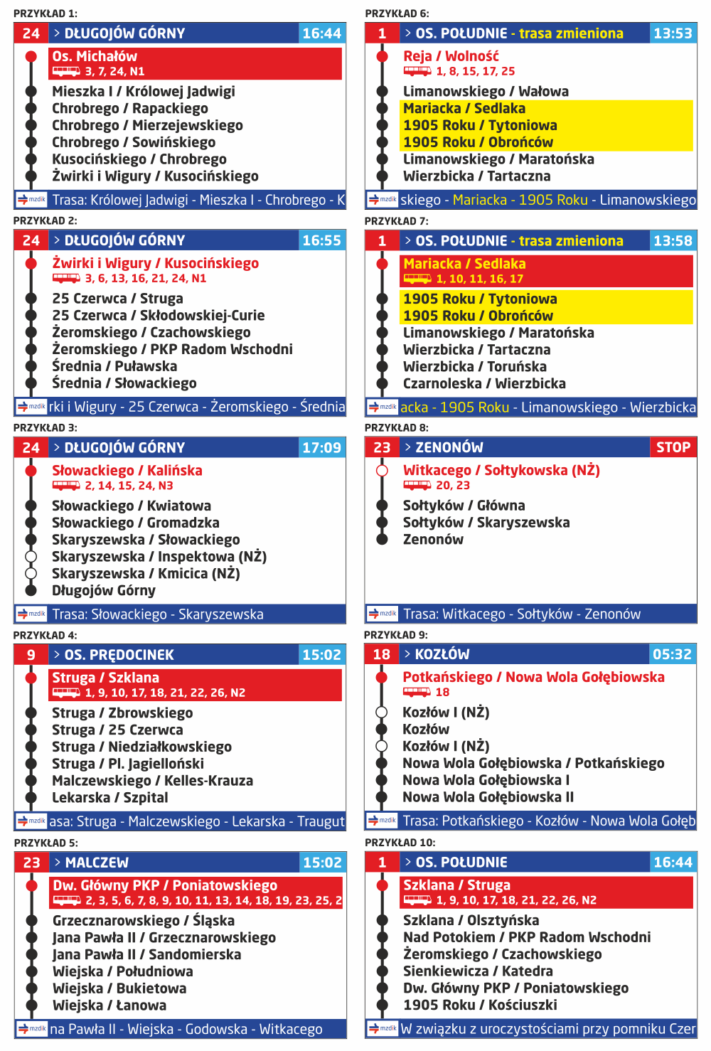 Pod nazwą najbliższego przystanku (lub tego, do którego autobus już dojechał - jeżeli jest w kontrze) jest umieszczony piktogram autobusu i numery linii miejskich (przykłady 1-10). Uwaga! Numery te dotyczą nie tylko tego przystanku, na którym staje autobus linii, jaką jedziemy, ale także wszystkich przystanków znajdujących się w niewielkiej odległości od niego (głównie w obrębie skrzyżowań). Tak jest na przykład obok Dworca Głównego PKP, gdzie podawane są numery linii zatrzymujących się na wszystkich sześciu przystankach komunikacji miejskiej (przykład 5) - dwóch przy ulicy Poniatowskiego, trzech na Placu Dworcowym i jednym koło poczty przy ulicy Beliny-Prażmowskiego. Podobnie jest chociażby przy ulicy Szklanej (przykład 10). Zatrzymują się tam tylko autobusy miejskie linii 1 i N2. Wystarczy jednak, że pasażer przejdzie stamtąd na jeden z dwóch pobliskich przystanków Struga / Szklana (znajdujących się w obrębie tego samego skrzyżowania), gdzie ma do wyboru kilka innych linii. Analogicznie w przypadku przystanku stojącego w rejonie sklepu Lidl (przykład 4) podana jest także linia 1, gdyż można do niej wsiadać na dwóch pobliskich przystankach. Jeżeli w jakimś miejscu nie ma możliwości przesiadek, to wyświetla się tylko numer linii, którą jedziemy (przykład 9).